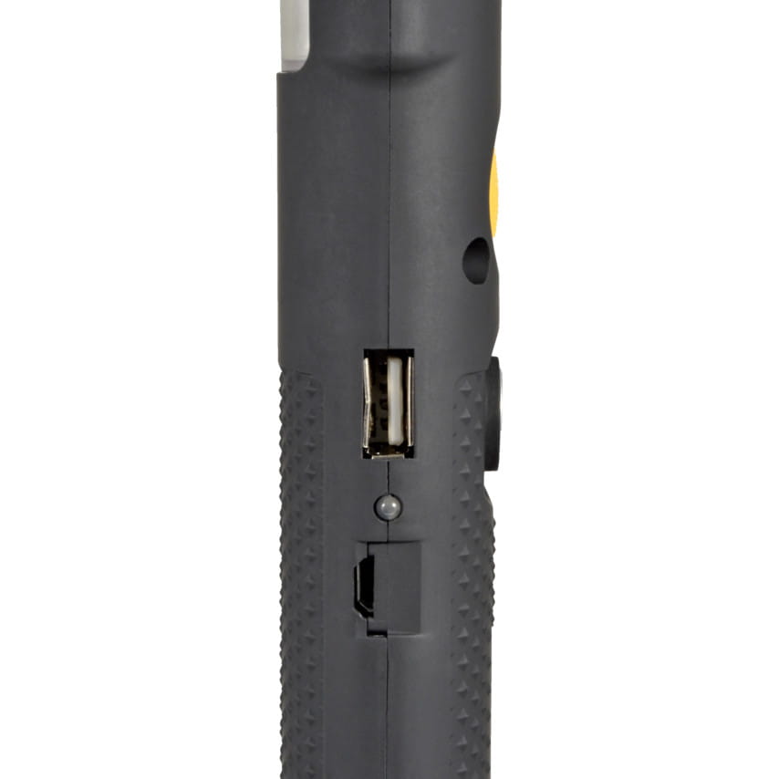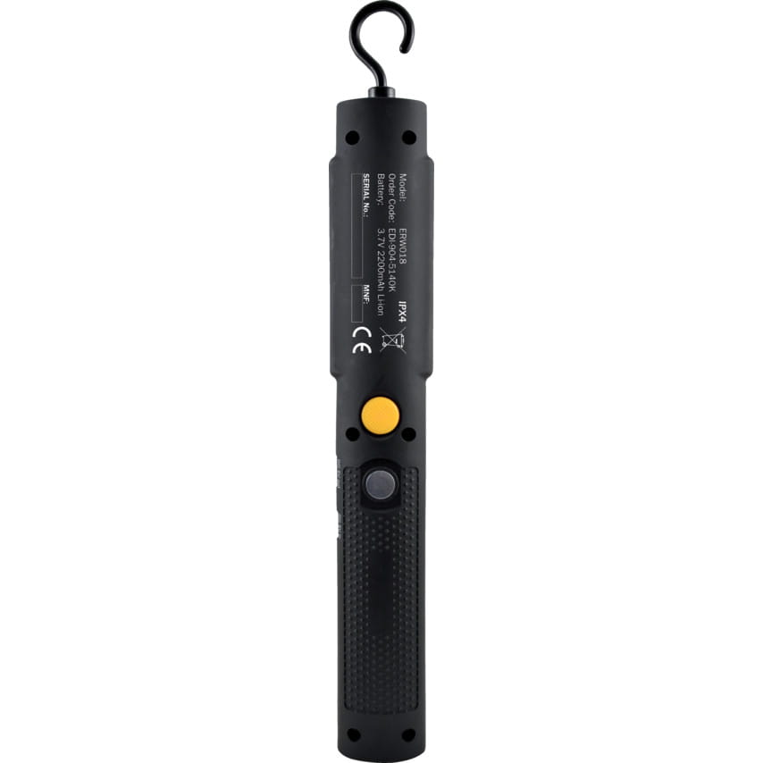 Super bright white 18 x 0.5 SMD LED. 2 lighting modes: 100% on and 30% on. Rubberised finish. 300 lumens. 2200mAh Li-ion battery. 360 degree swivel hanging hooK. Integrated magnet on back.