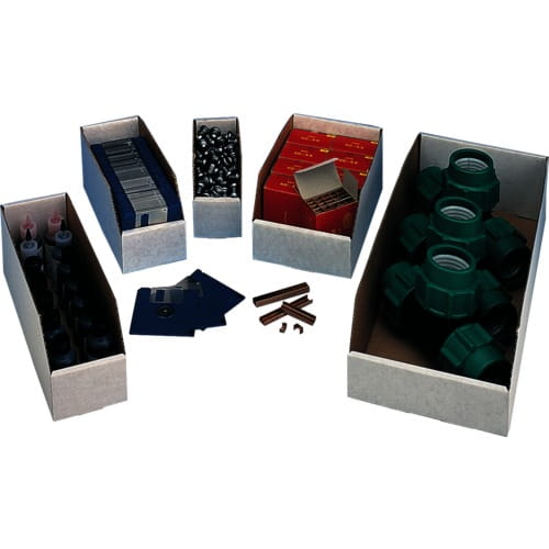 Dla łatwej identyfikacji i przechowywania części i innych elementów na półkach. Wykonane z tektury falistej z panelami, na których można zapisać zawartość pojemników. Dostarczane rozłożone (płaskie) w opakowaniach po 50 sztuk.