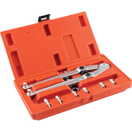 Kuty w stali chromowo-wanadowej, klucz jest regulowany przez obrót śruby centralnej. Może być stosowany na nakrętkach z trzpieniami z nawierconymi otworami i jest dostarczany z 8 wymiennymi przetyczkami, które są obustronnie zaokrąglone dla nakrętek z górnymi otworami.
