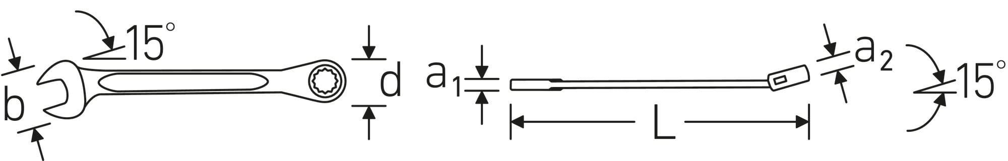 przełączane, z podwójnym sześciokątem, 72 zębów, do prac w ograniczonych przestrzeniach, kąt pracy tylko 5°, końcówka oczkowa odchylona 15°, stal stopowa chromowa, chromowane.