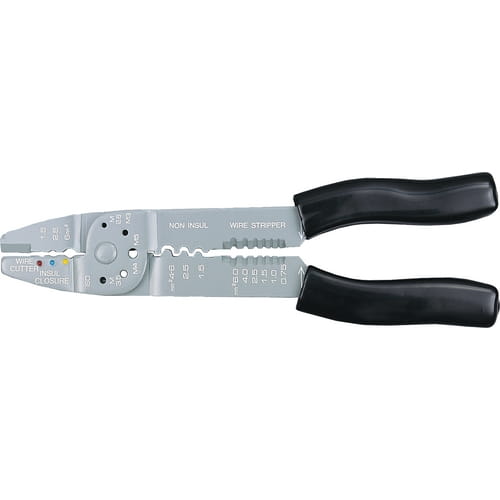Szczypce wykonane z tłoczonej stali. Nasadki z PVC. Do zaciskania, ściągania izolacji i cięcia kabli. W plastikowej kasecie z 100 końcówkami.