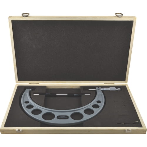 Emaliowany kabłąk, wrzeciona docierane z końcówkami z węglika spiekanego. Zawiera wysokiej jakości uchwyt z nakrętką regulującą. Wielkości 25 - 50mm/1 - 2" i większe dostarczane z trzpieniami wzorcowymi. Wykonano zgodnie z BS 870.