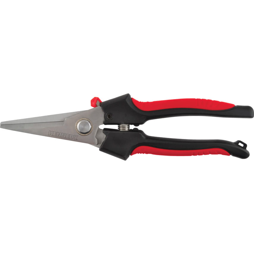 For cutting cardboard, leather, rope, cord, wire, paper & many other materials. Precision ground & hardened stainless steel blades - HRC 50-54 - with one serrated cutting edge to reduce slipping. Lightweight polypropylene handles with spring loaded action. Easy reach safety thumb lock, convenient for right & left hand users.