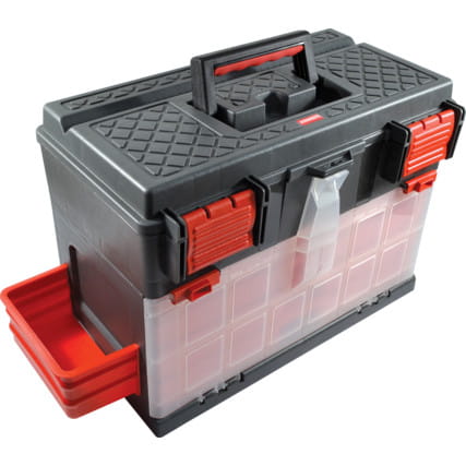 - Ergonomiczny uchwyt z miękkim uchwytem od spodu zapewnia optymalny chwyt i wygodę podczas transportu nawet w pełni załadowanej skrzynki narzędziowej