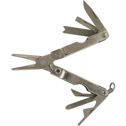 35mm mini nóż zaokrąglony, 5 x 25mm płaski wkrętak, otwieracz do butelek z 2mm szpicem, płaski pilnik i wyżłobiony podważacz haków, 35mm rozwiertak, otwieracz puszek, szczypce ząbkowane ostrza, szczęki do cięcia drutu, otwieracz sprężynowy, pierścień zawieszka do kluczy.