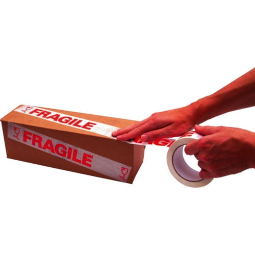 Winylowe samoprzylepne taśmy o cichym działaniu z czytelnymi nadrukami. Nadruki zawierają instrukcje manipulowania oraz informacje kontroli jakości w celu ostrzeżenia przewoźników i zapewnienia, że przesyłki będą odpowiednio delikatnie traktowane, aby bezpiecznie dostarczyć delikatne towary lub płyny. Wyraźne czerwone nadruki na białym tle. Może być nakładana za pomocą pistoletu lub dyspensera stołowego.