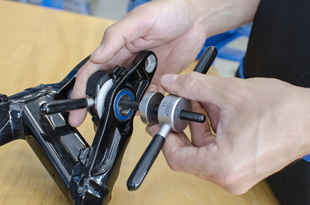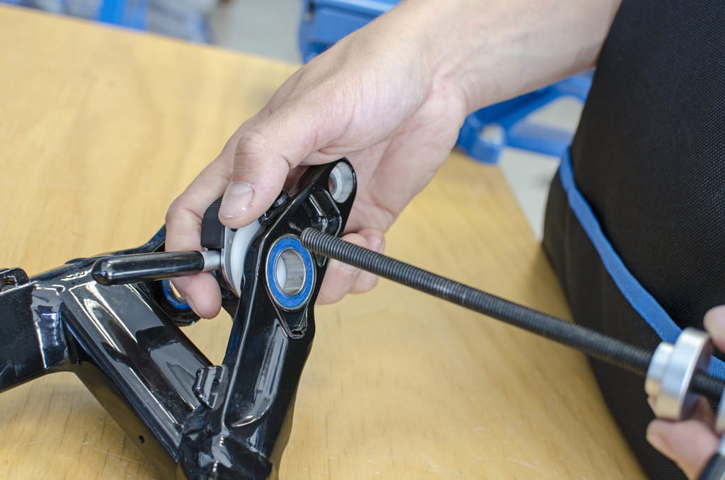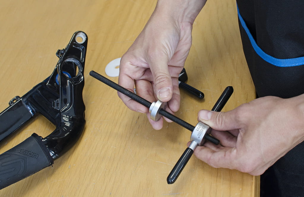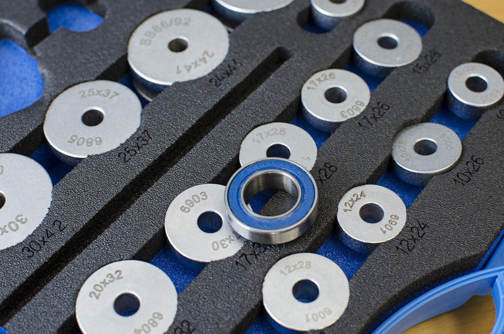 Uniwersalny zestaw pras do łożysk Unior 1721 pozwala na montaż łożysk w większości znanych ram i komponentów. Zestaw zawiera wrzeciono z dwoma gwintowanymi uchwytami, adaptery do standardowych łożysk: 608, 1526, 6000, 6001, 6802, 6803, 6804, 6805, 6900, 6901, 6902, 6903, R6, 28x17 (Hope), BB30, wszystkich standardów Press-fit jak również dwa różnego rozmiaru plastikowe adaptery chroniące karbonowe płaszczyzny podczas montażu łożysk. Jeden z gwintowanych uchwytów posiada system szybkiego zapięcia, który pozwala na szybkie i łatwe wciskanie łożysk. Wszystkie narzędzia są umieszczone na dwóch wkładkach SOS włożonych do plastikowej skrzynki.