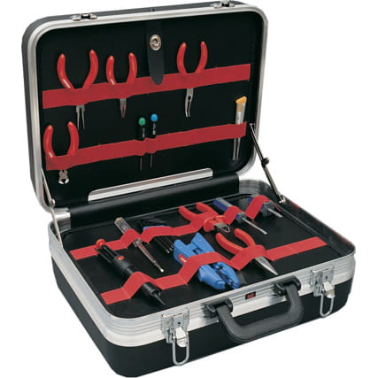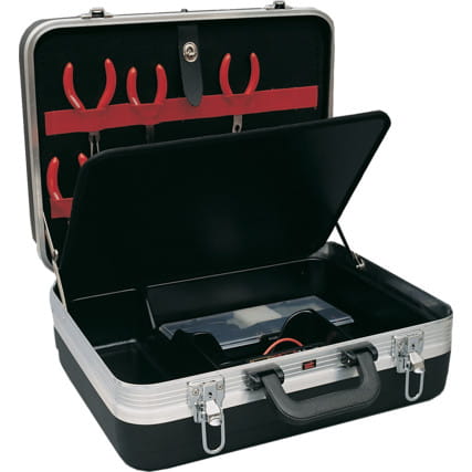 Konstrukcja przeciwudarowa. Dwa dopasowane panele narzędziowe na zawiasach z elastycznymi uchwytami pętlowymi na narzędzia. Kieszeń na dokumenty w pokrywie. Główny pojemnik z przegródkami. Podwójny zamek. 2 komplety kluczy.Specyfikacja produktu: