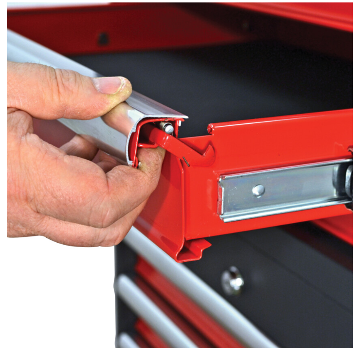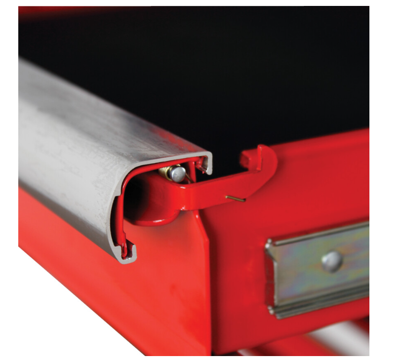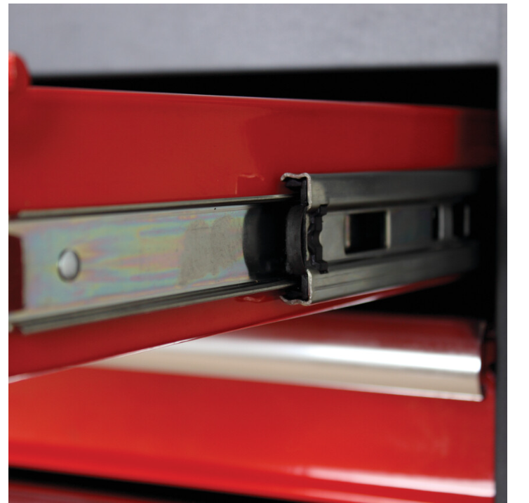 Z pełnym wysuwaniem zapewniającym łatwiejszy dostęp. Samozamykacze magnetyczne zabezpieczają szuflady w bezpiecznej pozycji. Indywidualne zatrzaski zapewniające pełny wysuw szuflady i pozwalające na jednoczesne otwarcie tylko jednej szuflady zapobiegają przewróceniu szafki. Wyściełane 3-milimetrowym tworzywem EVA zabezpieczają powłokę oraz chronią narzędzia. 45-milimetrowe prowadnice kulkowe zapewniają stabilność szuflady oraz płynne otwieranie - nawet pod dużym obciążeniem.