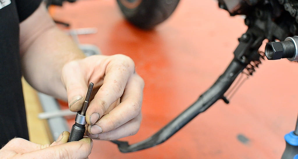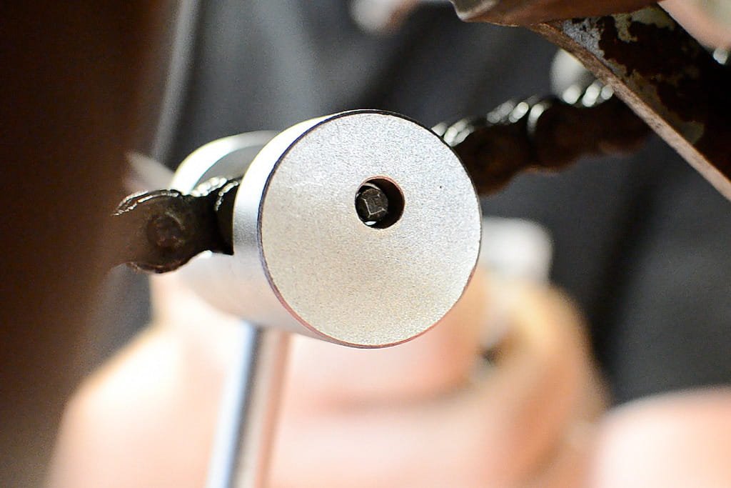 - umieść zestaw w narzędziu. Umieść narzędzie na łączonym łańcuchu i zaciśnij pin nitujący przez pokręcenie rękojeścią aż do mocnego połączenia łańcucha