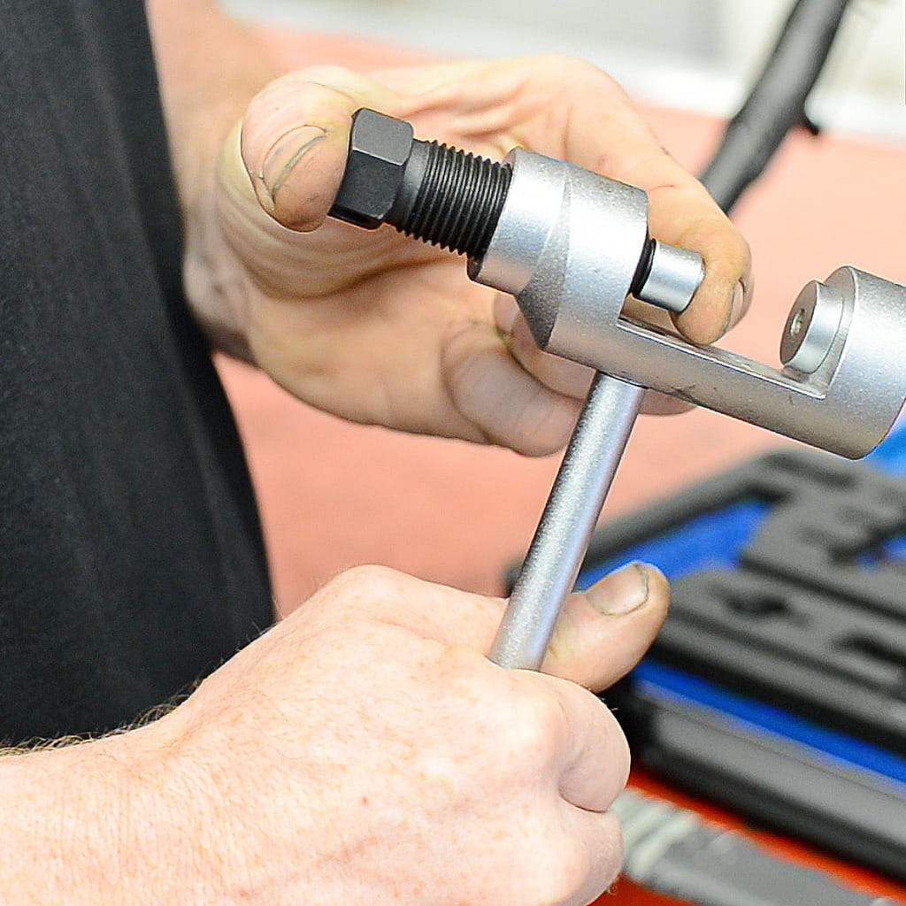 - umieść pin w narzędziu, ustaw narzędzie na połączeniu łańcucha i obracaj narzędziem aż pin wypadnie