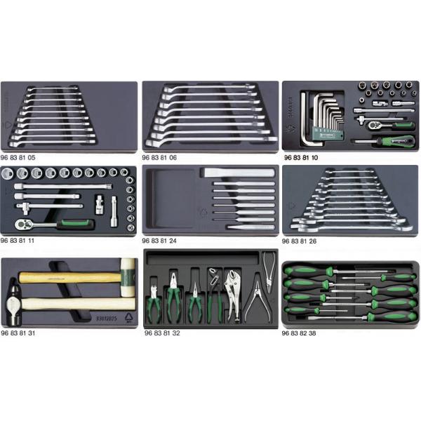 Grupa narzędziowa Stahlwille:| 102 narzędzia, w wytłoczkach z tworzywa sztucznego, wytłoczki z tworzywa 9x1/3 i 1x3/3 do 4 szuflad (Nr 98VA do 2 szuflad), pasujących do stołu warsztatowego Nr 92KM G, wózka warsztatowego Nr 90, 95, 95VA; skrzyni na kasety Nr 920 i Rollbox Nr 922N. |