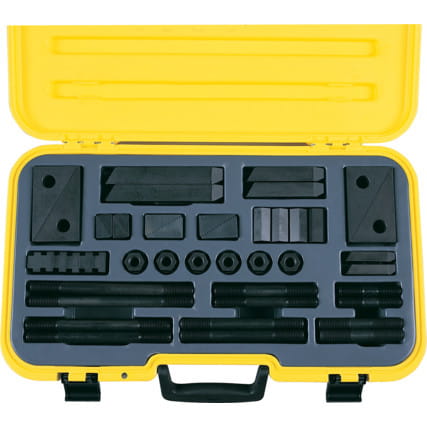 Zaprojektowany aby zaoszczędzić czas mocowania przedmiotów na stołach maszyn. Wszystkie elementy zostały wykonane zgodnie ze stali niestopowej węglowej S45C (JIS)/CK45 (DIN). Elementy hartowane do twardości HRC 28 - 32 i mają powierzchnie wykończone fosforanem manganu. Zapakowane w solidną plastikową walizkę.Zawartość: