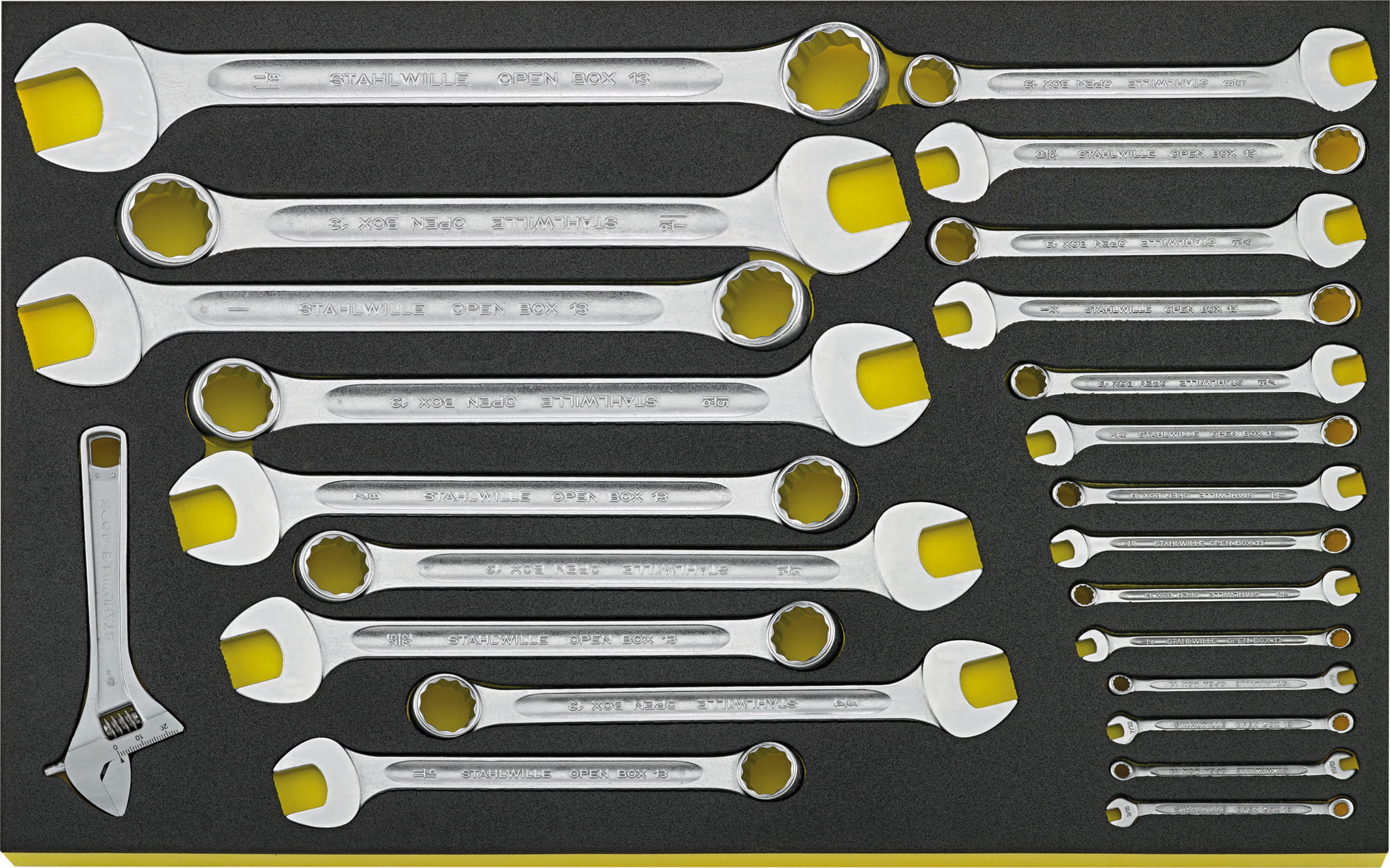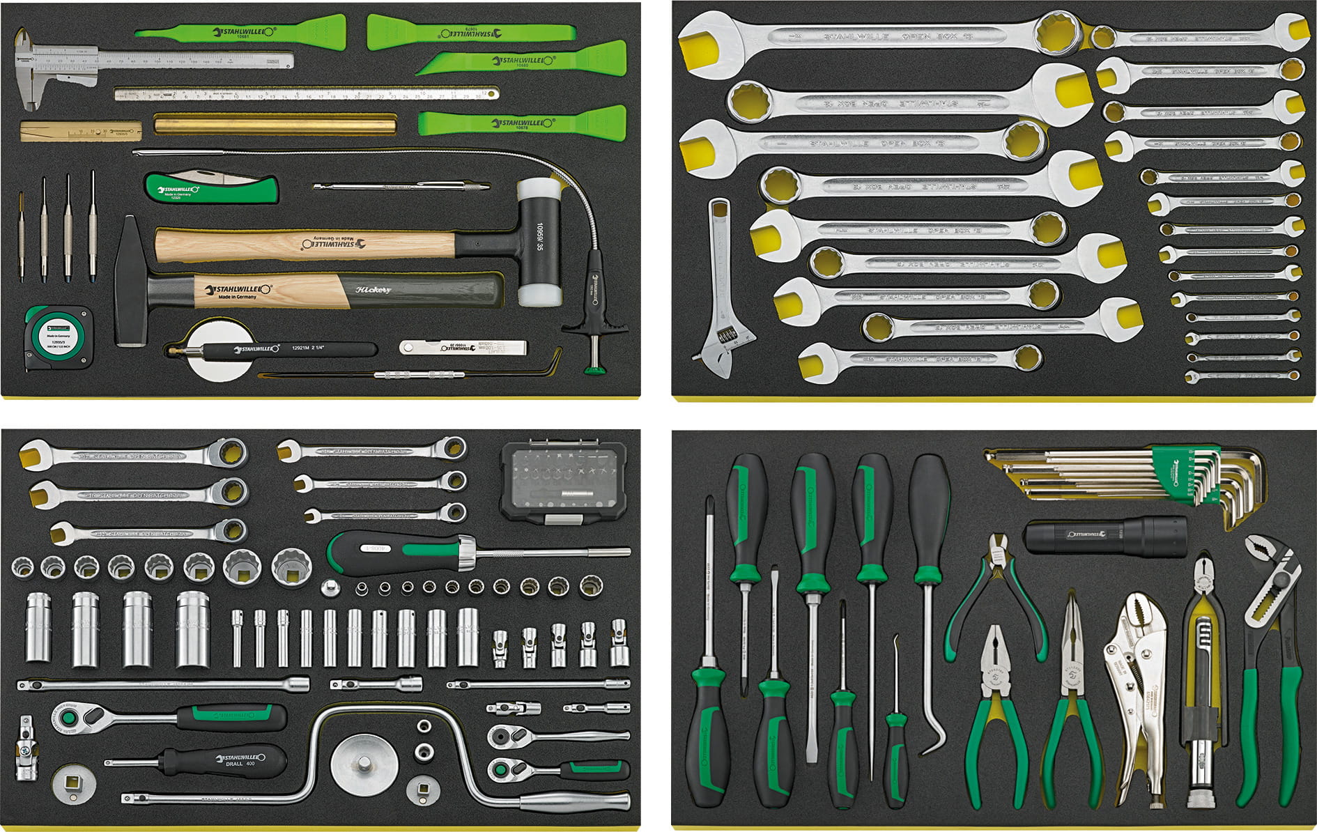 Grupa narzędziowa Stahlwille:| do konserwacji samolotów i helikopterów, 122 narzędzi, w wytłoczkach TCS , wytłoczki z tworzywa 4x3/3 do 4 szuflad (Nr 98VA do 2 szuflad), pasujących do stołu warsztatowego Nr 92KM G, wózka warsztatowego Nr 90, Nr 95, Nr 95VA; skrzyni na kasety Nr 920 i Rollbox Nr 922N. |