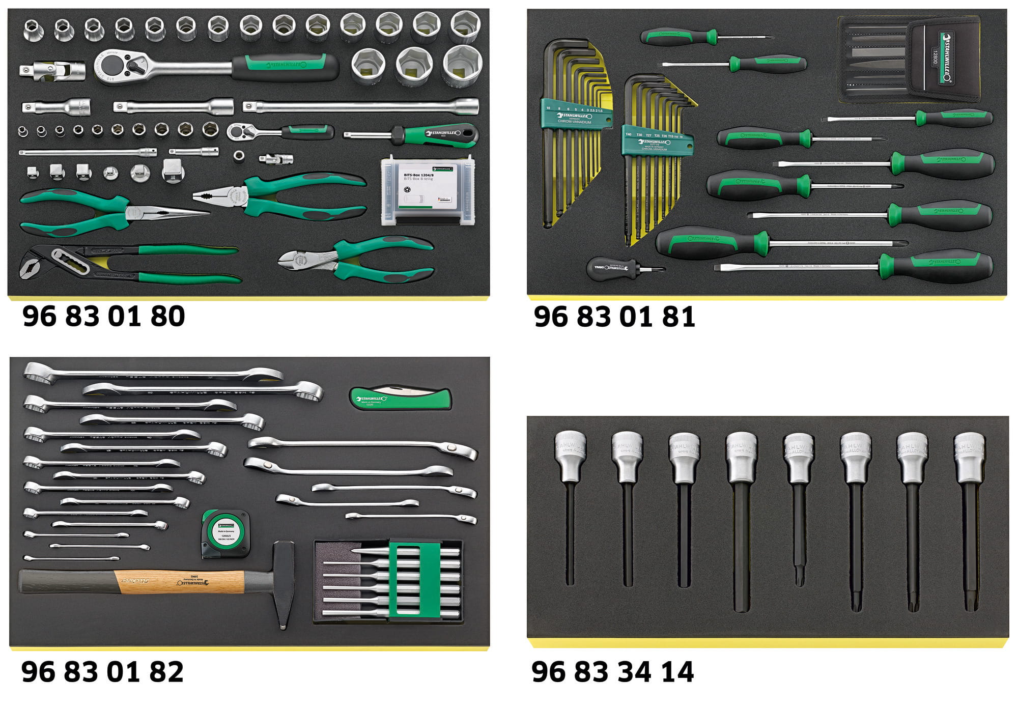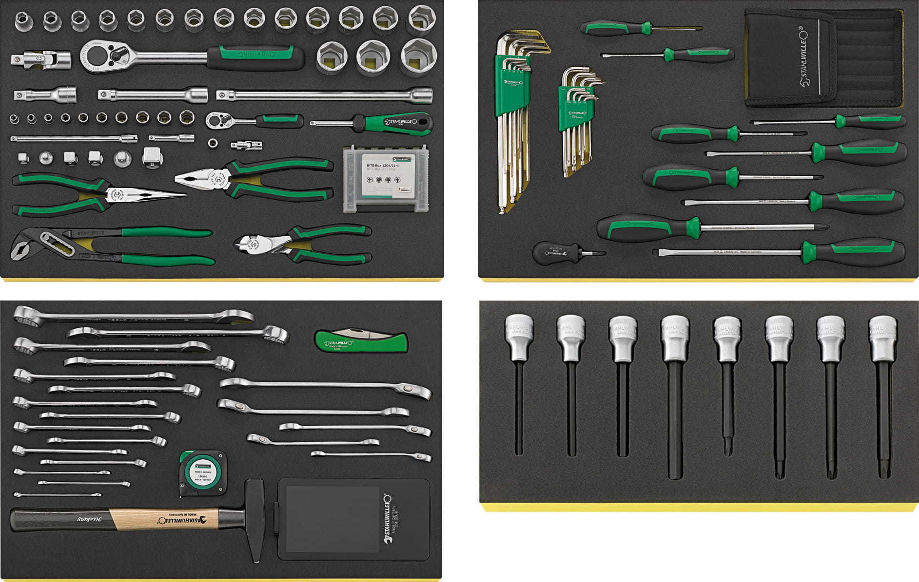 Grupa narzędziowa Stahlwille:| (Zestaw podstawowy), 139 narzędzi, w wytłoczkach TCS, wytłoczki z tworzywa 3x3/3 i 1x1/3 do 4 szuflad (Nr 98VA do 2 szuflad). |
