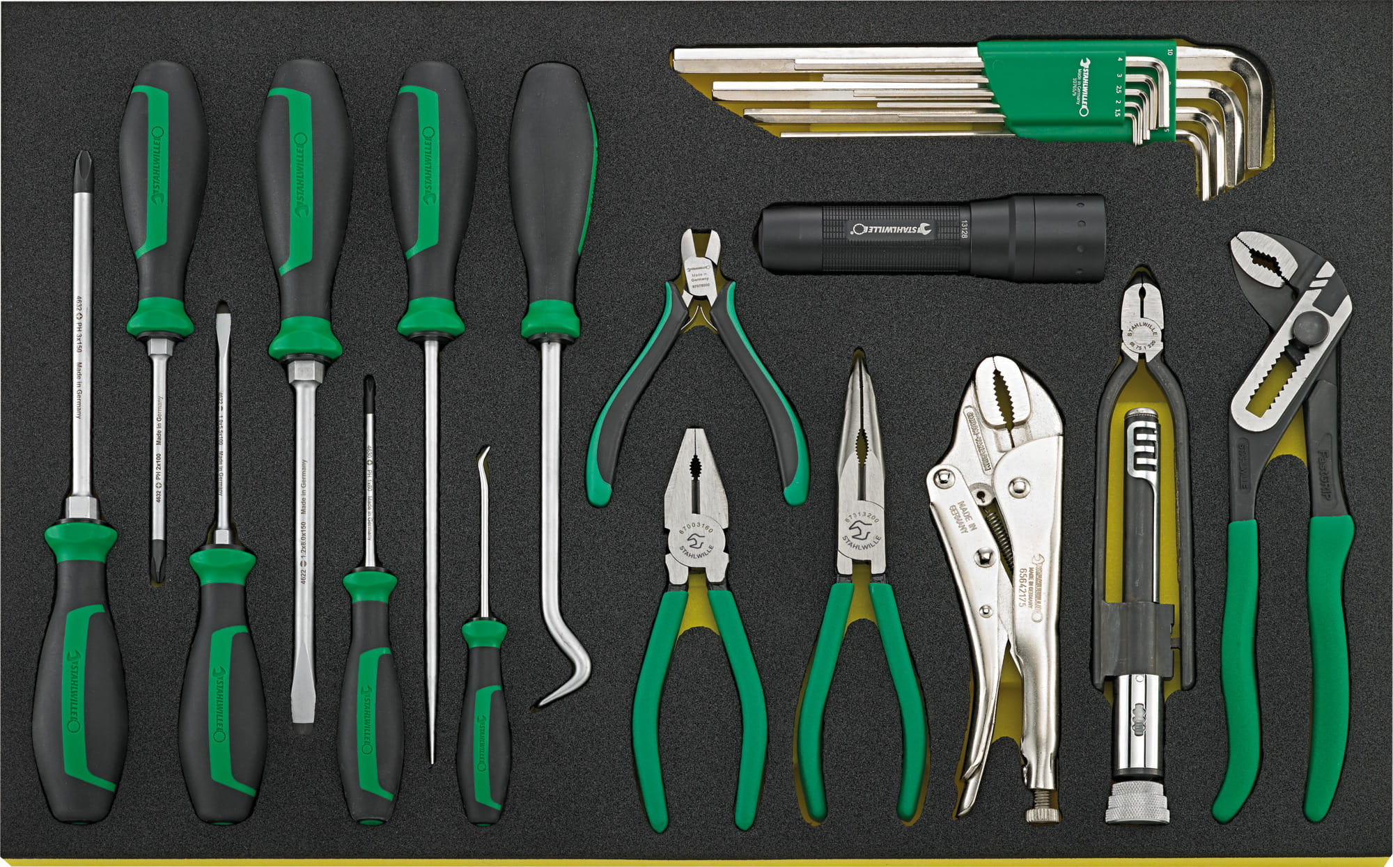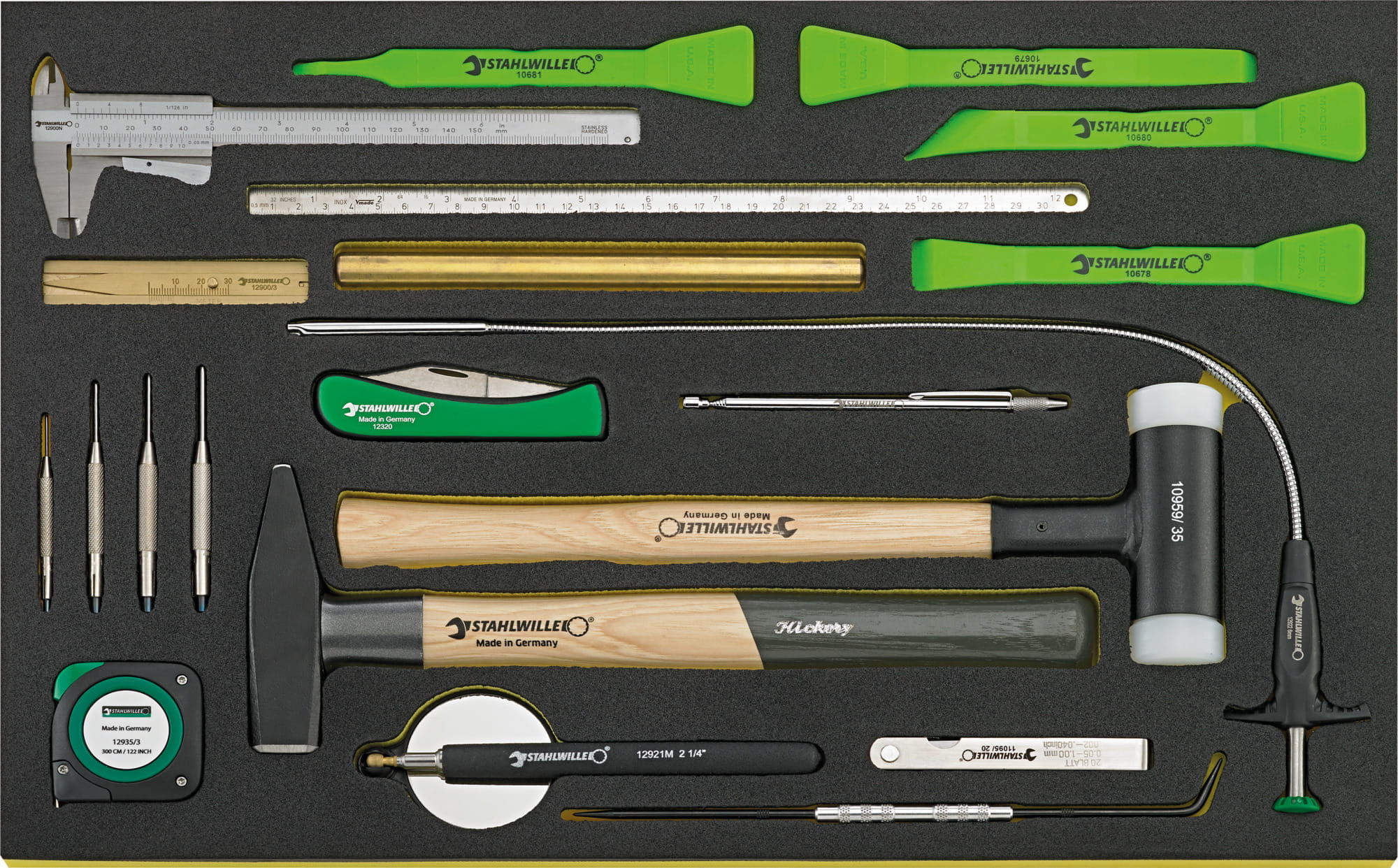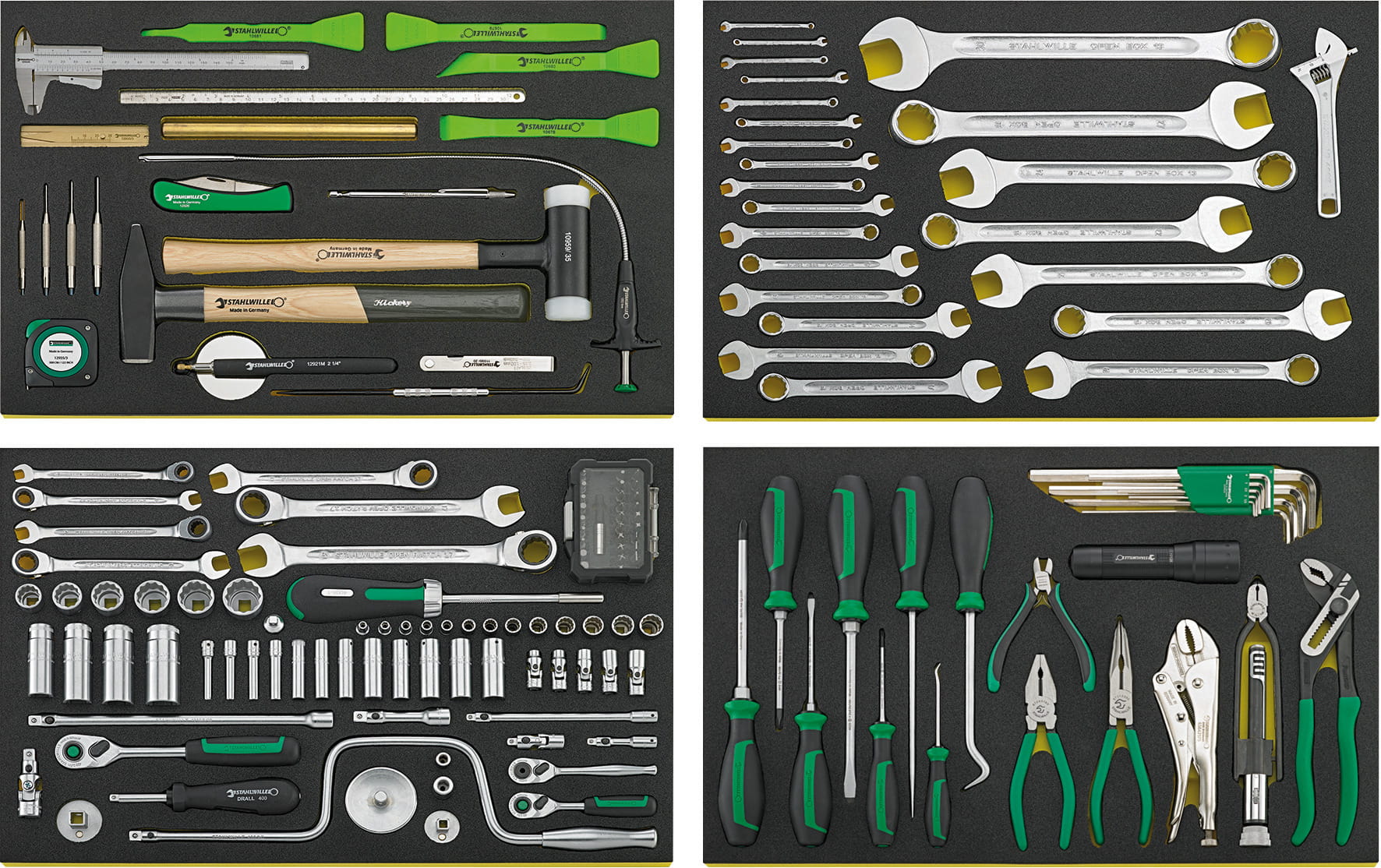 Grupa narzędziowa Stahlwille:| do konserwacji samolotów i helikopterów, 121 narzędzi, w wytłoczkach TCS , wytłoczki z tworzywa 4x3/3 do 4 szuflad (Nr 98VA do 2 szuflad), pasujących do stołu warsztatowego Nr 92KM G, wózka warsztatowego Nr 90, Nr 95, Nr 95VA, skrzyni na kasety Nr 920 i Rollbox Nr 922N. |