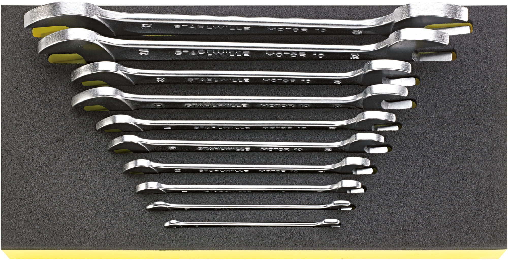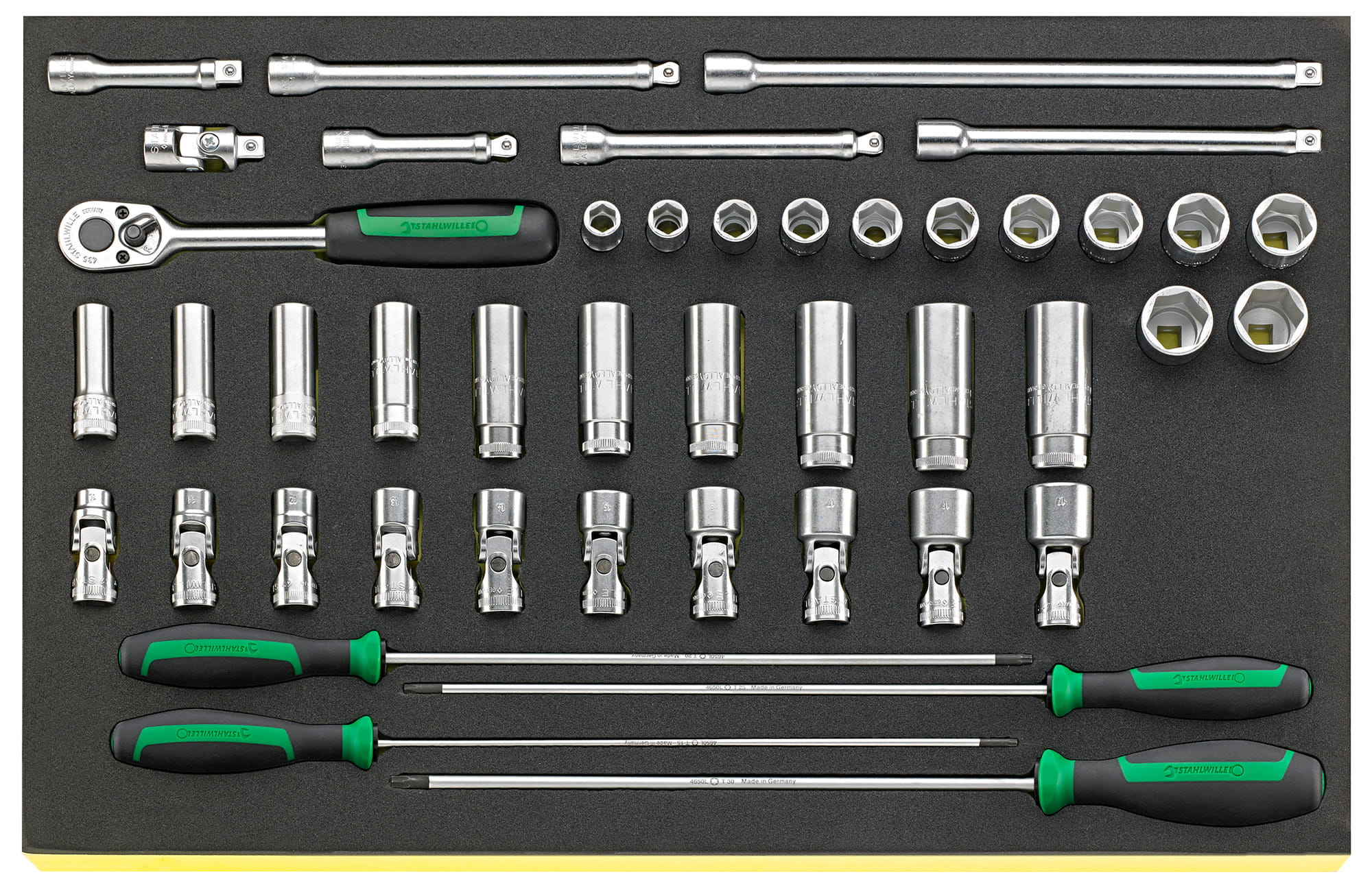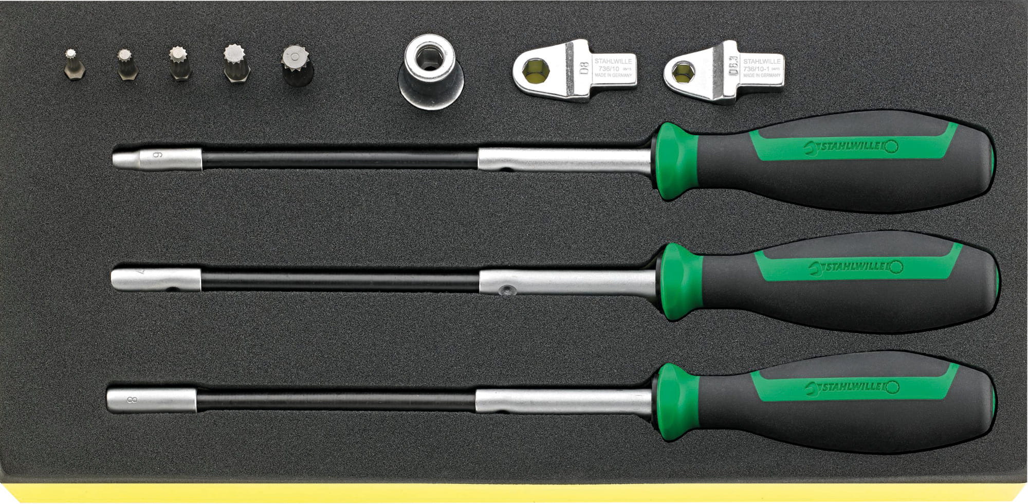 Grupa narzędziowa Stahlwille:| 73 narzędzi, w wytłoczkach TCS, wytłoczki z tworzywa 2x1/3, 1x2/3 i 1x3/3 do 3 szuflad (Nr 98VA do 1,5 szuflad). |