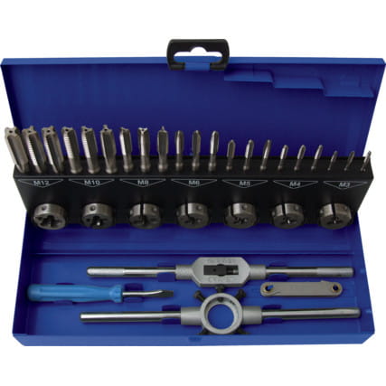 | Includes | (1) Bar Type Tap Wrench: M1-M12 (1) Die Stock: 25mm OD (1) Flat Bladed Screwdriver: 6mm (1) Metric Thread Pitch Gauge (7) HSS Dies: 3-0.50, 4-0.70, 5-0.80, 6-1.00, 8-1.25, 10-1.50, 12-1.75 (7) Straight Flute Plug Taps: 3-0.50, 4-0.70, 5-0.80, 6-1.00, 8-1.25, 10-1.50, 12-1.75 (7) Straight Flute Second Taps: 3-0.50, 4-0.70, 5-0.80, 6-1.00, 8-1.25, 10-1.50, 12-1.75 (7) Straight Flute Taper Taps: 3-0.50' 4-0.70, 5-0.80, 6-1.00, 8-1.25, 10-1.50, 12-1.75 Carrying Case |