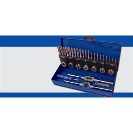 Metryczny M3 - M12Wszechstronny zestaw do gwintowania składający się z gwintowników i narzynek maszynowych HSS umieszczonych w metalowym pudełku.