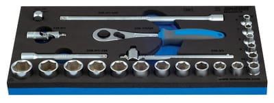 Zestaw kluczy nasadowych 3/8" we wkładce SOS zawiera: