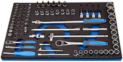 Zestaw kluczy nasadowych z akcesoriami we wkładce SOS zawiera: