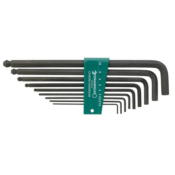 Grupa narzędziowa Stahlwille:| do śrub z gniazdem sześciokątnym, kąt wychylenia do 25° w każdą stronę, od rozw. klucza 3mm z pierścieniem podtrzymującym, z końcówką kulistą w dłuższej części klucza, do szybkich i bezpiecznych prac w trudno dostępnych miejscach, niezawodne uchwycenie śrub, w uchwycie, stal chromowo-wanadowa, oksydowane. Zawartość: 1,5; 2; 2,5; 3; 4; 5; 6; 8; 10mm |