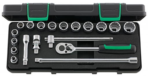 | w wytrzymałej, kompatybilnej skrzynce z tworzywa sztucznego ABS, 19-elementowy Zawartość: 14 nasadek z sześciokątem Nr 456: 8; 9; 10; 11; 12; 13; 14; 15; 16; 17; 18; 19; 21; 22mm 1 grzechotka Nr 435 2 przedłużacze Nr 427/3 (76mm), Nr 427/10 (240mm) 1 pokrętło z przesuwnym czopem Nr 425 1 przegub kardana Nr 428 |