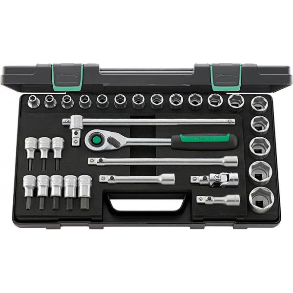 Grupa narzędziowa Stahlwille: 52/54/25/6QR - Komplet kluczy nasadowych 1/2" Grupa narzędziowa Stahlwille: w wytrzymałej, kompatybilnej skrzynce z tworzywa sztucznego ABS,