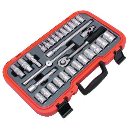 Nasadki: 8, 9, 10, 11, 12, 13, 14, 15, 16, 17, 18, 19, 20, 21, 22, 23, 24, 25, 26, 27, 30 i 32mm. Nasadki do świec: M10 i M14.Akcesoria: Grzechotka szybko zwalniająca, przetyczka, przegub uniwersalny, 75, 125 i 250mm przedłużacze. Solidna dopasowana kaseta plastikowa z otworem na kłódkę i uchwytem.
