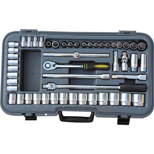 | Includes | Extension Bar 75, 125 and 250mm Ratchet Handle Robust fitted case Screwdriver Bits Hex: 4, 5, 6, 7, 8, 10, 12, 14, 17, 19mm Screwdriver Bits Philips: No.2, No.3, No.4 Screwdriver Bits Slotted: 9 and 14mm Sliding T-Handle Sockets: 8, 9, 10, 11, 12, 13, 14, 15, 16, 17, 18, 19, 20, 21, 22, 23, 24, 25, 26, 27, 28, 29, 30, 32, 33, 36mm Spark Plug Sockets: M14 and M10 Swivel Handle Universal Joint |