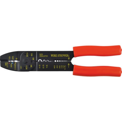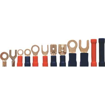 Szczypce wykonane z tłoczonej stali. Nasadki z PVC. Do zaciskania, ściągania izolacji i cięcia kabli. W plastikowej kasecie z 100 końcówkami.Zakres grubości: 0.75 - 6.