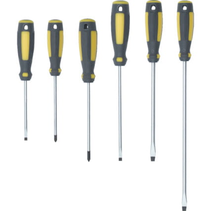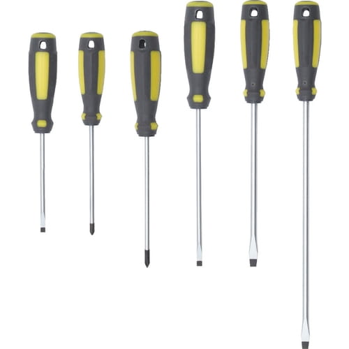 Ergonomicznie zaprojektowane rączki z podwójnego materiału i trzech części dla ulepszonego momentu obrotowego i zredukowania zmęczenia materiału. Chromo - wanadowe ostrza z magnetycznymi końcówkami i otworem w rączce do wieszania.